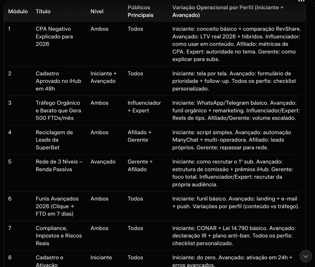 Este minicurso foi estruturado para quem quer entrar no CPA ou crescer com mais controle, entendendo desde cadastro, ativacao e funis ate negociacao, compliance, anti-ban, tracking e escala.